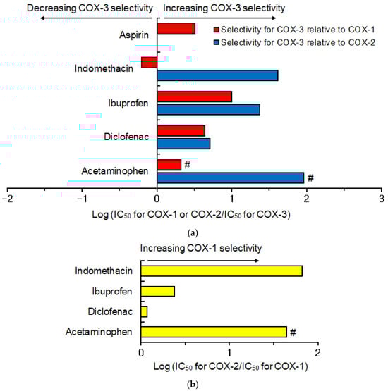 Chandrasekharan et al. [54] compared the inhibitory effects of acetaminophen and NSAIDs on COX-1, COX-2, and COX-3 by measuring PG production in COX-transfected Sf9 insect cells after exposure to arachidonic acid. Selectivity for COX-3 relative to COX-1 or COX-2 of acetaminophen and NSAIDs are shown in Figure 5a, which was prepared by calculating Log (IC50 for COX-1/IC50 for COX-3) or Log (IC50 for COX-2/IC50 for COX-3) in the presence of 5 μM arachidonic acid for acetaminophen and 30 μM arachidonic acid for NSAIDs [54]. When adding 30 μM arachidonic acid to the assay system, acetaminophen inhibited neither COX-1 nor COX-2 even at 1000 μM. Acetaminophen appeared to inhibit COX-3 more selectively than NSAIDs. However, the higher COX-3 selectivity of acetaminophen than that of diclofenac and ibuprofen is ascribable to the false selectivity that was produced by the inappropriate interpretation of the experimental results of COX-1, COX-2, and COX-3 activity measurements. Because COX-3 is a COX-1 splicing variant, acetaminophen is very likely to show selectivity for COX-1 as shown in Figure 5b, which was prepared by calculating Log (IC50 for COX-2/IC50 for COX-1). In the comparative assessment [54], the IC50 values for COX-3 of acetaminophen were 64 μM and 460 μM in the presence of 5 and 30 μM arachidonic acid, respectively, whereas those of NSAIDs ranged from 0.008 μM for diclofenac to 0.24 μM for ibuprofen in the presence of 30 μM arachidonic acid, indicating that the COX-3 inhibitory activity of acetaminophen is not as potent as that of NSAIDs in COX-transfected insect cells.