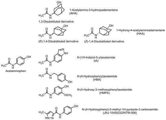 Since adamantane derivatives have been used for drug design, Fresno et al. [141] replaced a phenyl ring of acetaminophen with an adamantane ring to synthesize 1,3-disubstituted, (E)-1,4-disubstituted, and (Z)-1,4-disubstituted derivatives, as shown in Figure 9. They assessed the pharmacological effects and mechanisms of 1-acetylamino-3-hydroxyadamantane (AHA) and 1-hydroxy-4-acetylaminoadamantane (HAA). In the mouse acetic acid writhing test, AHA, HAA (a stereoisomeric mixture), and acetaminophen were intraperitoneally administered at 100–500 mg/kg, 250–750 mg/kg, and 100–200 mg/kg, respectively. Both AHA and HAA showed antinociceptive effects with greater potency in HAA. HAA acted on TRPA1 channels as a selective antagonist, while it neither activated cannabinoid receptors nor inhibited COX. Adamantane derivatives not only exhibited more improved analgesic activity compared with acetaminophen but also displayed biocompatibility, without producing toxic effects in chronic treatments.
