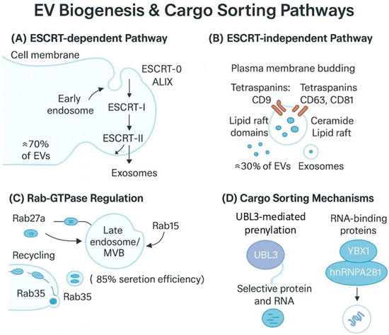 EV biogenesis occurs through two primary molecular pathways with distinct mechanistic features and cargo selectivity profiles. The ESCRT-dependent pathway involves sequential recruitment of four multiprotein complexes: ESCRT-0 (Hrs, STAM) recognizes ubiquitinated cargo and nucleates endosomal sorting; ESCRT-I (Tsg101, Vps28) and ESCRT-II (Vps25, Vps36) mediate membrane budding and cargo concentration; and ESCRT-III (CHMP4B, Vps4) executes membrane scission and vesicle release, accounting for approximately 70% of exosome production with high fidelity for ubiquitinated protein cargo [50,51,52,53]. The ESCRT-independent pathway relies on tetraspanin-enriched microdomains (CD9, CD63, CD81) that organize membrane curvature through lateral protein clustering, ceramide-mediated membrane rigidification by neutral sphingomyelinase, and lipid raft-dependent sorting mechanisms that preferentially package lipid-modified proteins and contribute to 30% of EV production with enhanced membrane stability [54,55,56]. These pathways demonstrate complementary cargo selectivity: ESCRT-dependent EVs are enriched in cytosolic proteins and RNA-binding complexes, while ESCRT-independent EVs contain higher concentrations of membrane-associated proteins, lipid metabolic enzymes, and lipid mediators, with UBL3 serving as a key regulator that modulates protein prenylation and influences pathway selection through membrane domain organization [36,50,51].