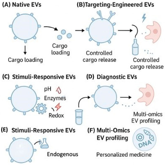EV-based delivery platforms and diagnostic applications. (A) Native EVs with natural targeting properties for basic therapeutic delivery. (B) Targeting-engineered EVs with targeting ligands (antibodies, peptides, aptamers) for enhanced specificity. (C) Hybrid EV-synthetic systems combine natural biocompatibility with synthetic functionality. (D) Stimuli-responsive EVs with controlled cargo release mechanisms. (E) Diagnostic EVs as biomarker reservoirs for liquid biopsy applications. (F) Multi-omics EV profiling for personalized medicine and companion diagnostics. Arrows indicate cargo loading, targeting, and release processes.