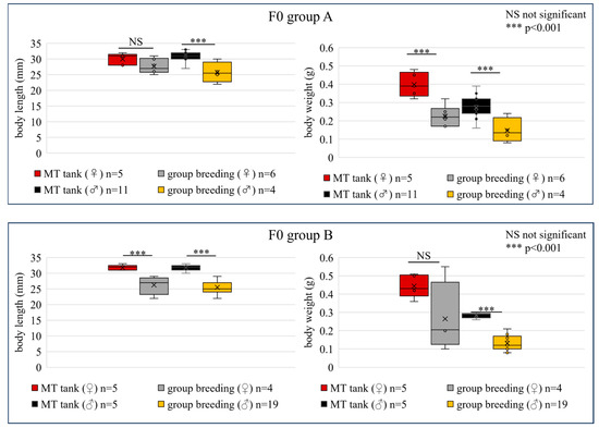 The survival rate of larvae and juveniles maintained in individualized tanks was 60%, which was higher than the 49% survival rate observed in conventional group breeding. Moreover, zebrafish body height and weight in the individualized MT tanks were higher than those in the conventional breeding group (Figure 3). In addition, the variation in body height and weight in individualized tanks was significantly lower than that in conventional group breeding, suggesting uniform feeding of all individual fish (Figure 3).