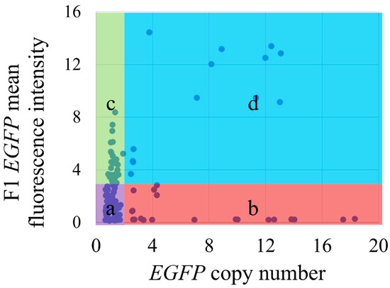 Cluster analysis in F1 generation of eGFP mean fluorescence intensity and eGFP copy number was analyzed as previously reported [19]. All plots were classified into four groups: a, low eGFP fluorescence and low eGFP copy number; b, low eGFP fluorescence and high eGFP copy number; c, high eGFP fluorescence and low eGFP copy number; d, high eGFP fluorescence and high eGFP copy number.