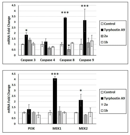 Anticancer drugs can alter the mRNA expression of essential proteins. Thus, the effects of tyrphostin A9, 1b, and 2a on mRNA expression of caspase 3, 4, 8, and 9, as well as protein kinases PI3K, MEK1, and MEK2 were studied (Figure 2). Only tyrphostin A9 led to increased mRNA expression of caspase 3, caspase 8, and caspase 9, as well as of MEK1 and MEK2. Tyrphostin A9 exhibited a slight insignificant upregulation of caspase 4 and PI3K mRNA. Notably, 1b showed only a slight increase in caspase 9 mRNA and downregulation of caspase 4 and PI3K, while 2a downregulated caspase 4 and caspase 8 more strongly (caspase 8 even significantly). The upregulation of caspase 3, caspase 8, and caspase 9 might be a hint at an efficient apoptosis induction by tyrphostin A9 in HCT-116 p53-wt cells.