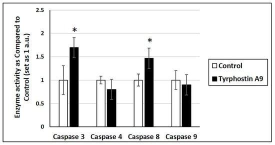Caspase activity in HCT-116 (p53-wt) cells treated with tyrphostin A9 at IC50 dose for 72 h by colorimetric assays. Values are the means of two independent experiments (±SD). * p < 0.05.