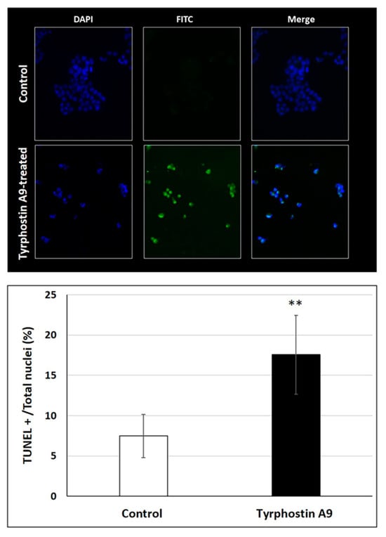 DNA fragmentation in HCT-116 (p53-wt) cells treated with IC50 doses of tyrphostin A9 for 72 h according to the TUNEL assay. Values are the means of three independent experiments (±SD). ** p < 0.01.