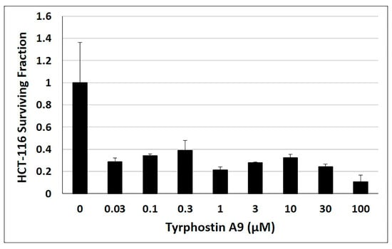 Clonogenic assay with HCT-116 (p53-wt) cells treated with tyrphostin A9 for 12 days at the indicated concentrations. Values are the means of three independent experiments (±SD).
