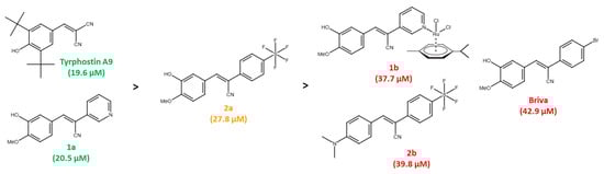 In addition to EGFR, other receptor tyrosine kinases (RTKs) associated with CRC malignancy include VEGFR, PDGFR, IGF-1R, FGFR, and c-Met, and many selective and multi-kinase inhibitors have been developed to treat CRC and other cancers. Approved RTK inhibitors for the therapy of CRC are cetuximab (an anti-EGFR antibody) and regorafenib (a multi-kinase inhibitor targeting PDGFR and VEGFR) []. The first compounds with tyrosine phosphorylation inhibitory activities were called tyrphostins and included erbstatin and benzylidenemalononitrile (BMN) compounds [,]. A prominent example is tyrphostin A9 (3,5-di-tert-butyl-4-hydroxybenzylidenemalononitrile, also known as tyrphostin 9, tyrphostin AG17, SF-6847, malonoben), which was described early on as a suppressor of EGF and inhibitor of EGFR phosphorylation in pancreatic cancer cells (Figure 1) []. However, tyrphostin A9 is better known for its PDGFR inhibitory activities and mitochondria-disrupting properties (as a protonophor) [,]. Further interesting targets of tyrphostin A9 were identified, e.g., the cytoplasmic tyrosine kinase PYK2 and the lipoxygenase 5-LO [,]. Replacement of one of the nitrile groups of BMNs by a 3-pyridyl group led to promising anticancer active EGFR inhibitors such as RG13022 (Figure 1) []. We found that the analogous isovanillyl derivative 1a (replacement of the RG13022 meta-methoxy group by a hydroxy group) and its dichlorido(p-cymene)ruthenium(II) complex 1b possess higher anticancer activity than RG13022 (Figure 1) []. Both tyrphostin A9 and compounds 1a and 1b have a phenolic hydroxy group, which seems to be important for anticancer activity. Substitution of the 3-pyridyl ring by 2-thienyl (Thio-Iva) or 4-bromophenyl moieties (Briva) led to selective activities against BRAF-mutant CRCs such as BRAFV600E HT-29 cells (Figure 1) [].