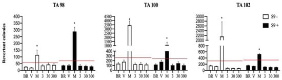 Effect of 3, 30, and 300 μg/plate of EFS on S. typhimurium quantification of revertants in strains TA98 and TA100 at 48 h and TA102 at 72 h, with and without the S9 fraction. The red line represents two-fold basal revertants. BR: basal revertants. V: vehicle DMSO (0.1%). M: mutagens TA98 Picrolonic acid (S9−) and 2-Amino-anthracene (S9+), TA100 methyl-N-nitrosoguanidine (S9−) and 2-Amino-anthracene (S9+), TA102 4-Nitroquinone oxide (S9−) and 2-Amino-anthracene (S9+). p < 0.05 versus twice the baseline revertants; * Statistically significant difference by one-way ANOVA and Dunnett’s post hoc test. The graph depicts the mean ± standard deviation of two independent experiments performed in triplicate.