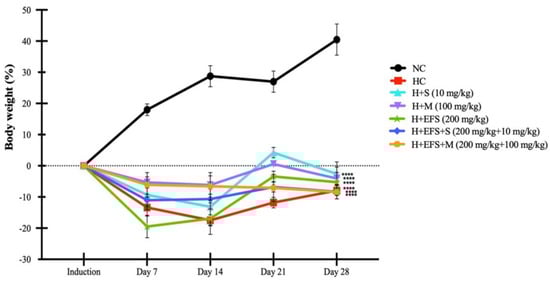 Percentage variation in body weight with respect to weight prior to induction in the antihyperglycemic evaluation of EFS. EFS: Ethanolic extract of F. splendens. Normoglycemic control (NC), hyperglycemic control (HC), hyperglycemic treated with sitagliptin (H + S), hyperglycemic treated with metformin (H + M), hyperglycemic treated with extract (H + EFS), hyperglycemic treated with extract and sitagliptin (H + EFS + S), and hyperglycemic treated with extract and metformin (H + EFS + M). Statistical significance was set at p < 0.0001. **** Statistically significant difference compared to the normoglycemic control group. Dunnett’s post hoc test was used to compare each hyperglycemic experimental group with the normoglycemic control group. Data are presented as the mean ± SEM. n = 6.
