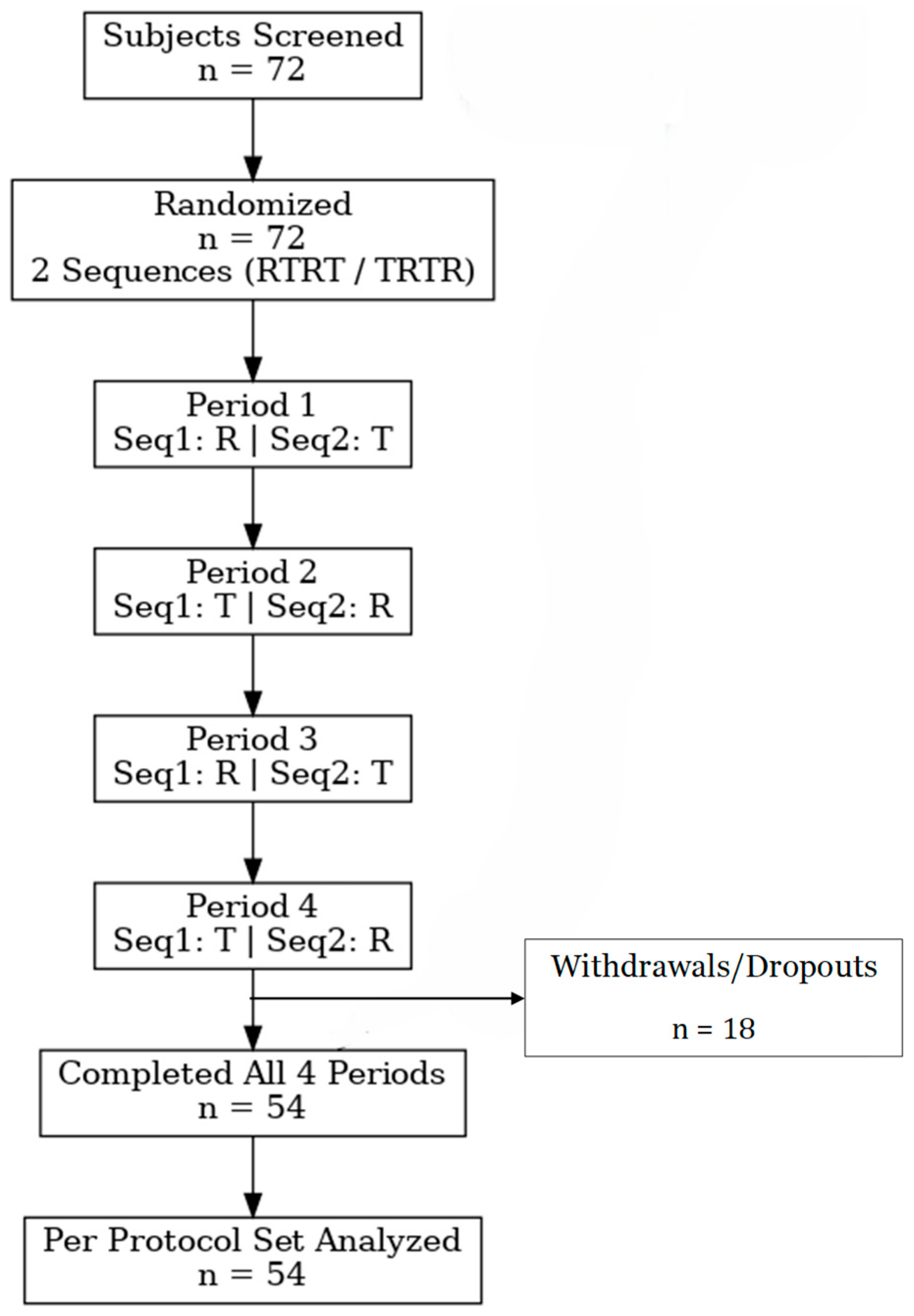 A total of 72 healthy participants meeting the eligibility requirements were randomized into one of the two treatment sequences using a computer-generated randomization schedule. The sequences were as follows: Sequence 1: RTRT; Sequence 2: TRTR.