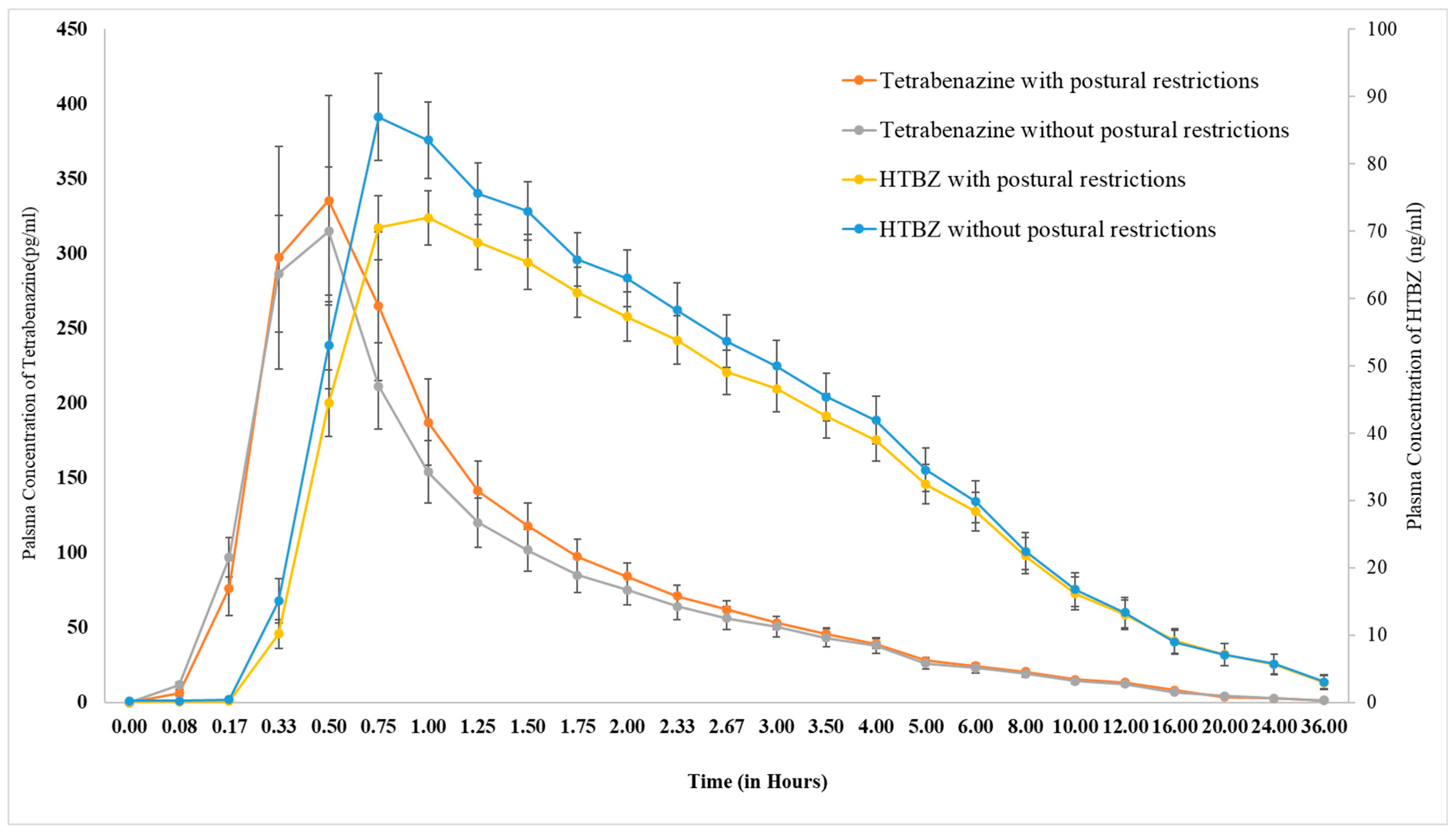 Post-dose posture was carefully controlled to evaluate the impact of positional restriction on the pharmacokinetic profile of tetrabenazine. Two conditions were implemented: