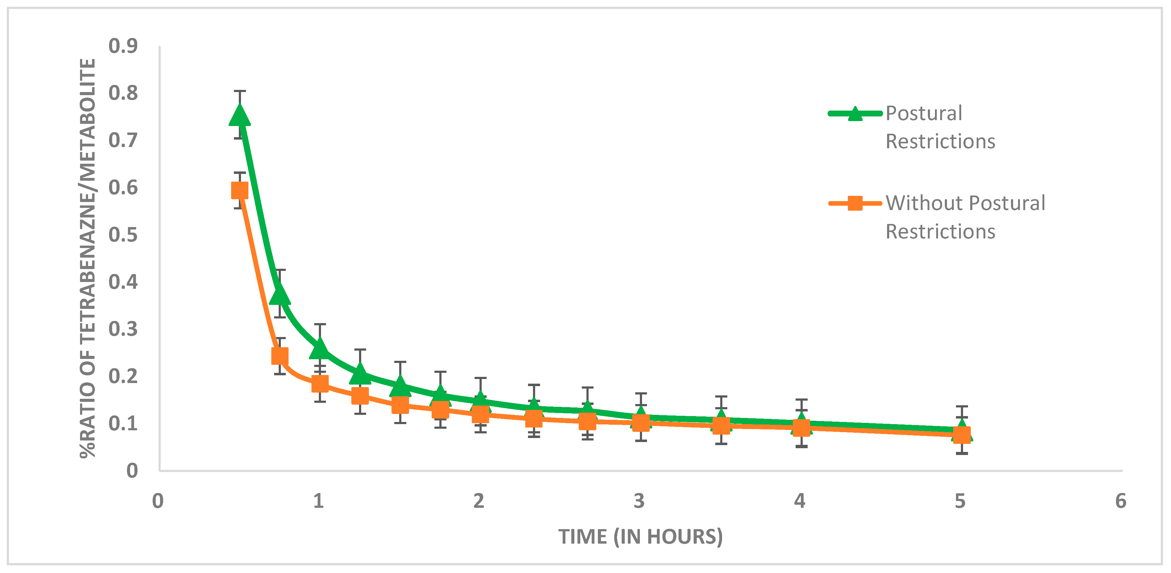 Figure 2). These increased ratios indicate a shift in metabolic efficiency—specifically, reduced first-pass conversion of tetrabenazine to HTBZ. These results further support a blood flow limited clearance mechanism, wherein reduced hepatic perfusion under restricted posture transiently decreases the metabolic conversion of tetrabenazine to HTBZ [