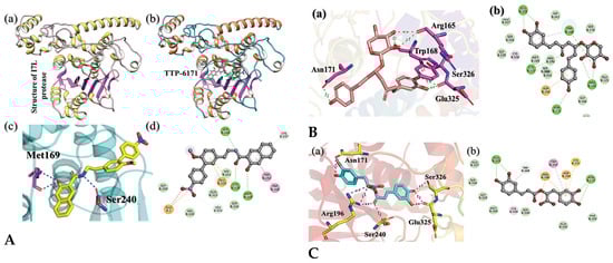 Beyond TOP1, the I7L protease, an essential enzyme in viral maturation, has been highlighted as a particularly potential antiviral target []. Leveraging structural predictions generated and refined by AlphaFold2, researchers have achieved high-confidence models suitable for virtual screening campaigns [,]. Benchmark docking studies with the known inhibitor TTP-6171 (control) revealed multiple stabilizing interactions, including hydrogen bonds and hydrophobic as well as π–π contacts with residues such as Met169, Ser240, Leu323, and Cys328 []. Virtual screening of TCM libraries identified TCM27763 and TCM33057 as stronger inhibitors than TTP-6171, interacting with key residues Trp168, Asn171, Arg196, Ser240, Glu325, Ser326, and Cys328 []. Notably, alnuside B, structurally related to TCM33057, achieved a docking score of −11.62 kcal/mol, forming multiple hydrogen bonds and hydrophobic interactions, indicative of potent suppression of I7L protease activity (Figure 2).