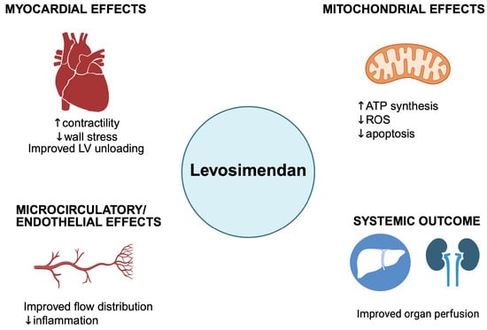 The multidimensional mechanism of Levosimendan. LV: left ventricle; ROS: reactive oxygen species; ATP: adenosine triphosphate. Up arrow: Increase; down arrow: decrease. Created in BioRender. Pirri, C. (2025) https://BioRender.com/80gjhg6, accessed on 16 October 2025.