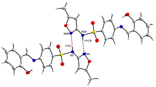The interactions observed for L2 and L5 highlight the source bonds of centrosymmetric dimers [44,45] involving donor and acceptor atoms from different molecules, thus producing a three-dimensional network [46,47]. In this case, there is a donor and acceptor element in the same molecule and their respective complements in the other molecule, in the case of the hydrogen of the amine, the nitrogen of the 5-methylisoxazole ring, being a classic representation of hydrogen bonds [48,49]. However, when the donor is a carbon of the main sp, sp2, or sp3 hybridizations and the acceptor is an electronegative element, these hydrogen bonds are indicated as non-classical [50,51].