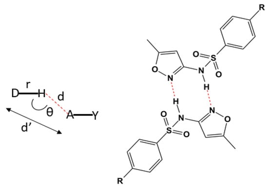 The most common distances for strong electrostatic bonds show the distances (d’) D····R presenting variations in the range of 2.2 to 2.5 Å [44,45,46,47,48] (Figure 3). However, there is a scientific consensus that the closer to 180°, the more intense the bond will be [44,46,49].