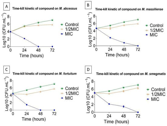 The broth microdilution method was validated by time-kill assays, which provide a dynamic overview of antibiotic activity over time [75], using the most potent antimicrobial candidate, L1, against Mycobacterium abscessus, M. massiliense, M. fortuitum, and M. smegmatis (Figure 4). Bacterial viability of strains treated with 1/2 the minimum inhibitory concentration (MIC) was assessed through kill curves at 0, 24, 48, and 72 h.