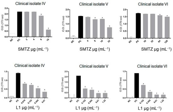 Effect of sub-inhibitory concentrations of SMTZ (top graphics) and L1 (bottom graphics) on the biofilm inhibition of clinical isolates CI-IV, CI-V, and CI-VI. Bars marked with * indicate a significant difference (p < 0.05) compared with the positive control (PC, untreated bacterial cultures with biofilm formation). The tests were subjected to the Student t-test (n = 3), considering statistical differences when p < 0.05.
