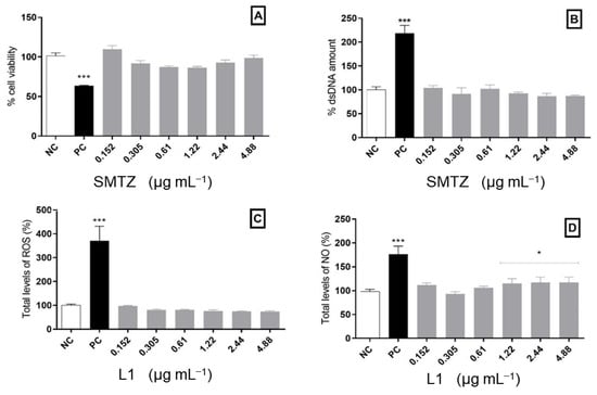 Cytotoxic analysis in PBMCs exposed to L1 for 24 h. (A) Cellular viability assessed by the MTT assay. (B) Free dsDNA quantification. (C) Total levels of ROS measured using 2′,7′-dichlorodihydrofluorescein diacetate (DCFH-DA). (D) Indirect quantification of NO. Bars marked with * indicate a significant difference (p < 0.05), and bars marked with *** indicate a significant difference (p < 0.01) compared with the negative control. The tests were subjected to the Student t-test (n = 3).