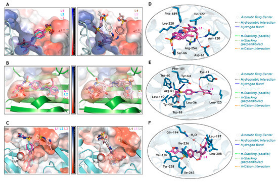 The SMTZ and its inorganic derivatives based on Cd(II), Ag(I), Ni(II), Hg(II), Cu(II), and Au(I) were previously evaluated against three feasible antibacterial targets: DHS, LasR, and PqsR, and a good correlation between in silico approach and in vitro results were found [42,92,93]. Thus, molecular docking calculations were carried out for the same protein targets to offer a molecular-level explanation of the antimicrobial activity of the SMTZ derivatives Schiff bases under study (L1–L6). The docking score values (dimensionless) are summarized in Table 4, while the corresponding docking poses are depicted in Figure 9. The highest docking score values were obtained for LasR, suggesting this protein as the main target. The Schiff bases L1–L6 had higher docking score values than those obtained for SMTZ [42] to LasR, which agrees with the experimental data indicating better MIC values for L1–L6 than for SMTZ in most standard strains and clinical isolates of RGM. Despite L1–L6 showing hydrophobic and hydrogen bonds as the main intermolecular forces to stabilize the interaction with the targets DHS, LasR, and PqsR (Figure 9), the highest docking score values were obtained for LasR, mainly due to the capacity of L1–L6 in being fully buried into the pocket of this protein (Figure 9).