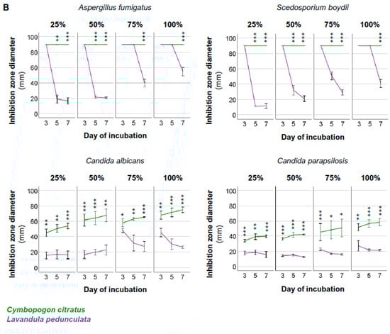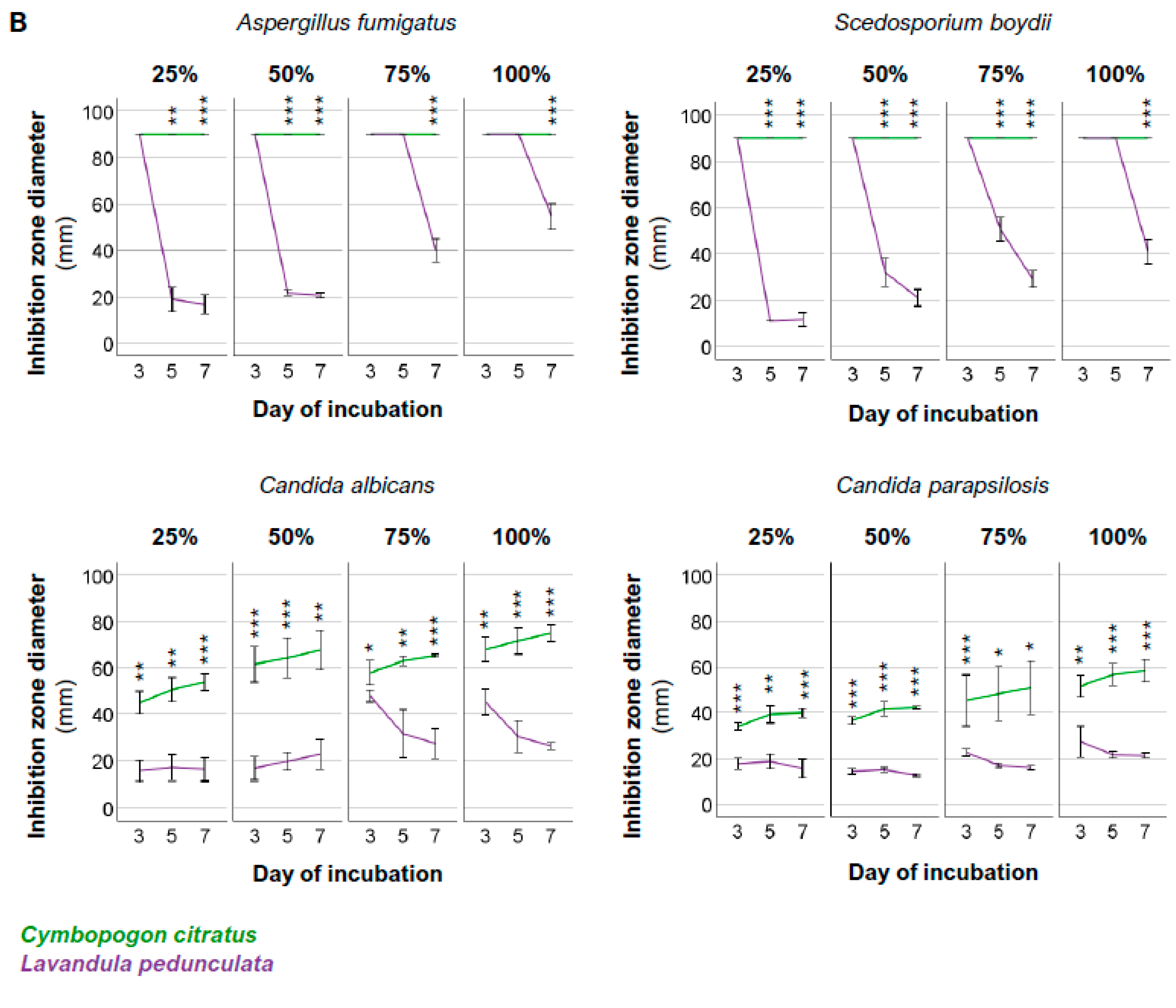 We also evaluated the antifungal activity of the Cymbopogon citratus EO and Lavandula pedunculata EO over time (Figure S3A,C). We found no statistically significant differences in the antifungal activity of the Cymbopogon citratus EO against Aspergillus fumigatus, Candida albicans, and Scedosporium boydii during the incubation time at any concentration tested. Concerning Candida parapsilosis, the IZD values significantly increased from the 3rd to the 7th day for the concentrations of 25%, 50%, and 75%, and from the 5th to the 7th day for the concentration of 75%. Conversely, the antifungal activity of the Lavandula pedunculata EO against Aspergillus fumigatus, Candida albicans, and Scedosporium boydii decreased with time. Regarding Aspergillus fumigatus, a statistically significant decrease was observed from the 3rd to the 5th day when using concentrations of 25% and 50%, while for the concentrations of 75% and 100%, a statistically significant decrease was observed from the 5th to the 7th day. In the case of Scedosporium boydii, the IZD values statistically significantly decreased from the 3rd to the 5th day when using concentrations of 25% and 50%, and from the 5th to the 7th day when using a concentration of 100%; for the concentration of 75%, the IZD values significantly decreased during the study. Concerning Candida albicans, there was a statistically significant decrease from the 3rd to the 5th day when using the concentration of 100%. No statistically significant differences in the antifungal activity of the Lavandula pedunculata EO against Candida parapsilosis throughout the experiment were observed.