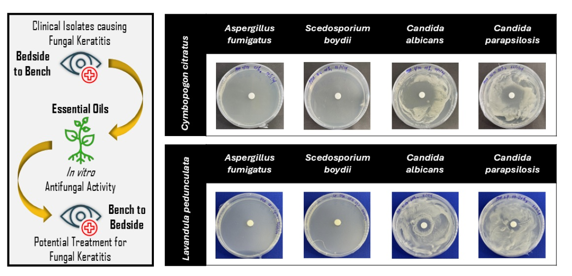 The focus on EOs is not only innovative but also timely considering the urgent need for novel treatments for FK that can overcome the limitations of the existing strategies. The in vitro antifungal assays showed the efficacy of Cymbopogon citratus EO against selected FK pathogens, particularly molds, demonstrating its viability as an effective antifungal agent. Concerning Lavandula pedunculata EO, while it exhibited a significant initial antifungal effect, its efficacy decreased over time, indicating a need for further optimization to explore its full therapeutic potential. This study highlights the potential of these natural products to address the limitations of current FK therapies.