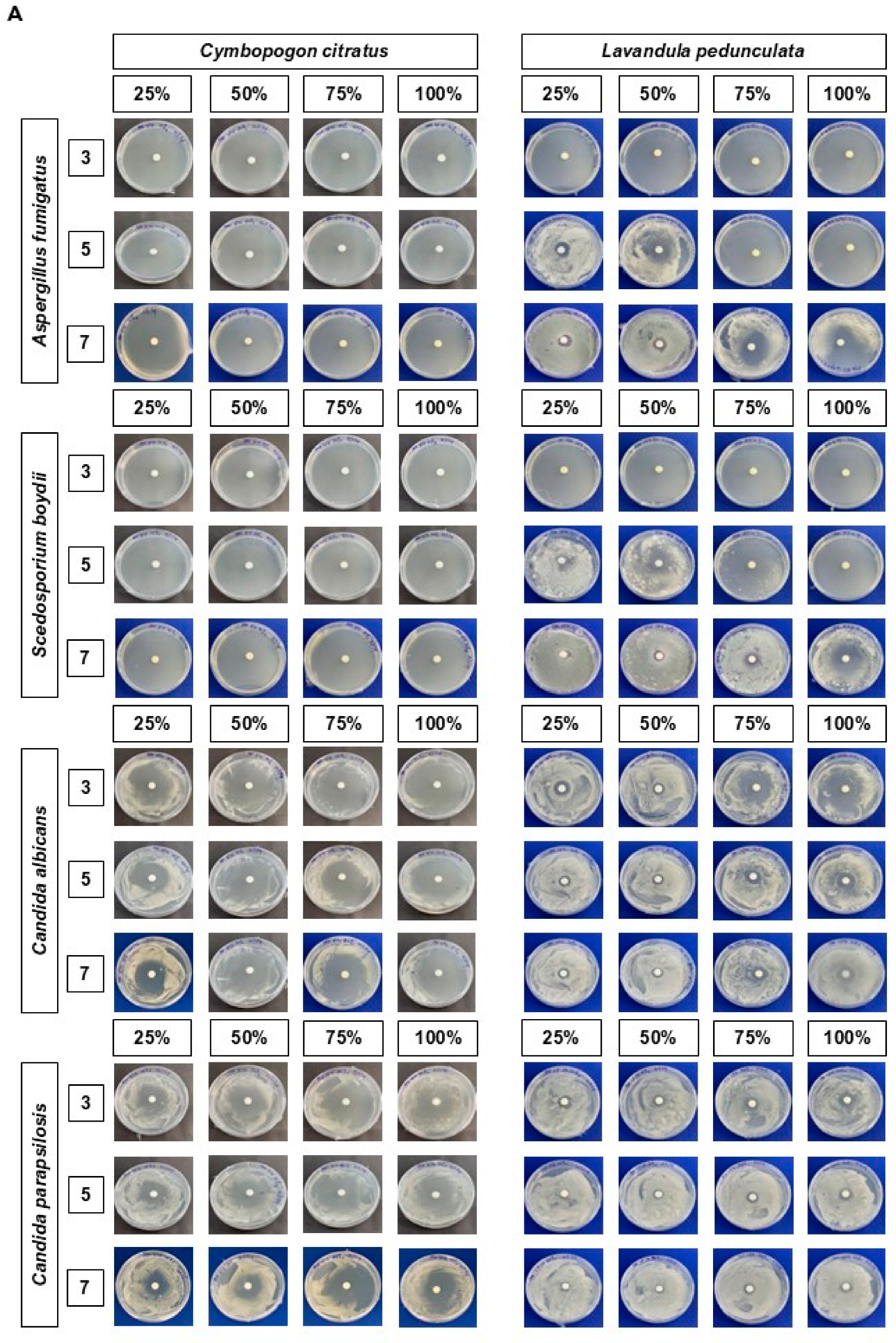 The antifungal activity of the Cymbopogon citratus EO and Lavandula pedunculata EO was assessed against selected yeasts and molds from our study samples, namely Aspergillus fumigatus, Candida albicans, Candida parapsilosis, and Scedosporium boydii, using the solid-phase disk diffusion in vitro assay [26,27]. The EOs were prepared at four concentrations (25%, 50%, 75%, and 100% (v/v%)) by diluting it in pure dimethyl sulfoxide (DMSO, Sigma-Aldrich, St. Louis, MO, USA). Sterile paper disks, with a diameter of 8 mm, were impregnated with 25 μL of the corresponding EO dilution, ensuring uniform saturation of the disk. Fungal suspensions were prepared and calibrated to contain 105 spores/mL and 105 CFU/mL for filamentous fungi and yeasts, respectively. From each suspension, 100 μL was uniformly spread onto 90 mm PDA Petri dishes and left to dry. An impregnated disk was placed onto the center of each culture plate. The cultures were incubated at 30 °C to allow for the growth of each tested pathogen. On the 3rd, 5th, and 7th days of incubation, the inhibition zone diameter (IZD) was manually measured at its widest point using a ruler, with each measurement performed in duplicate. Experiments were performed in triplicate, using three plates for each condition. The final IZD was determined by averaging the values for the three experiments. Paper disks infused with pure DMSO without EOs and without DMSO or EOs were used as positive and negative controls, respectively.