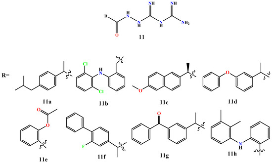 - Rane, R.; Satpute, B.; Patil, R.; Kumar, D.; Suryawanshi, M.; Patil, T.; Pawar, A.; Gawade, B.; Sakat, S. Synthesis and molecular docking of novel biguanide-NSAIDs hybrid with dual anti-diabetic and anti-inflammatory activity. J. Mol. Struct. 2025, 1320, 139512. [Google Scholar] [CrossRef]