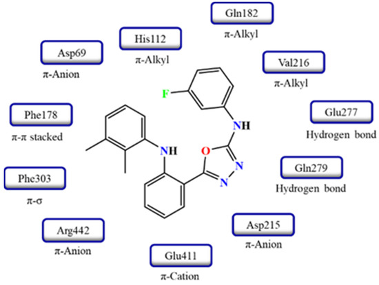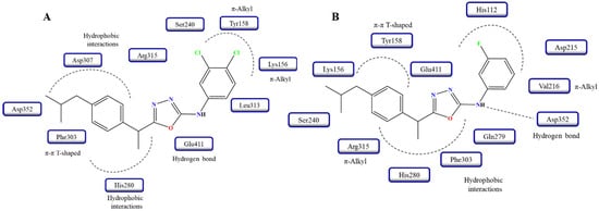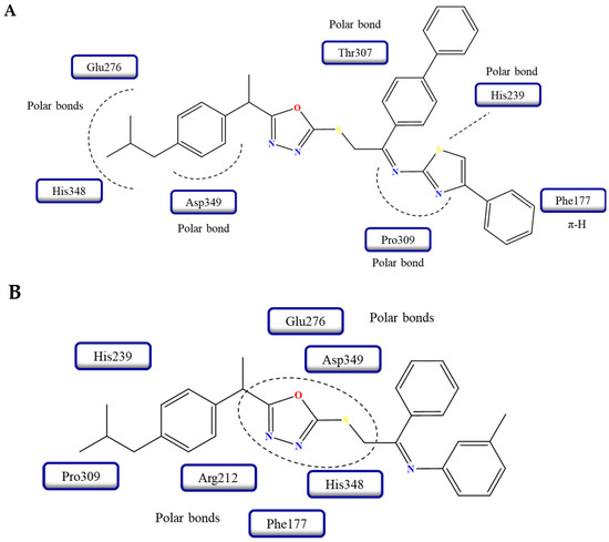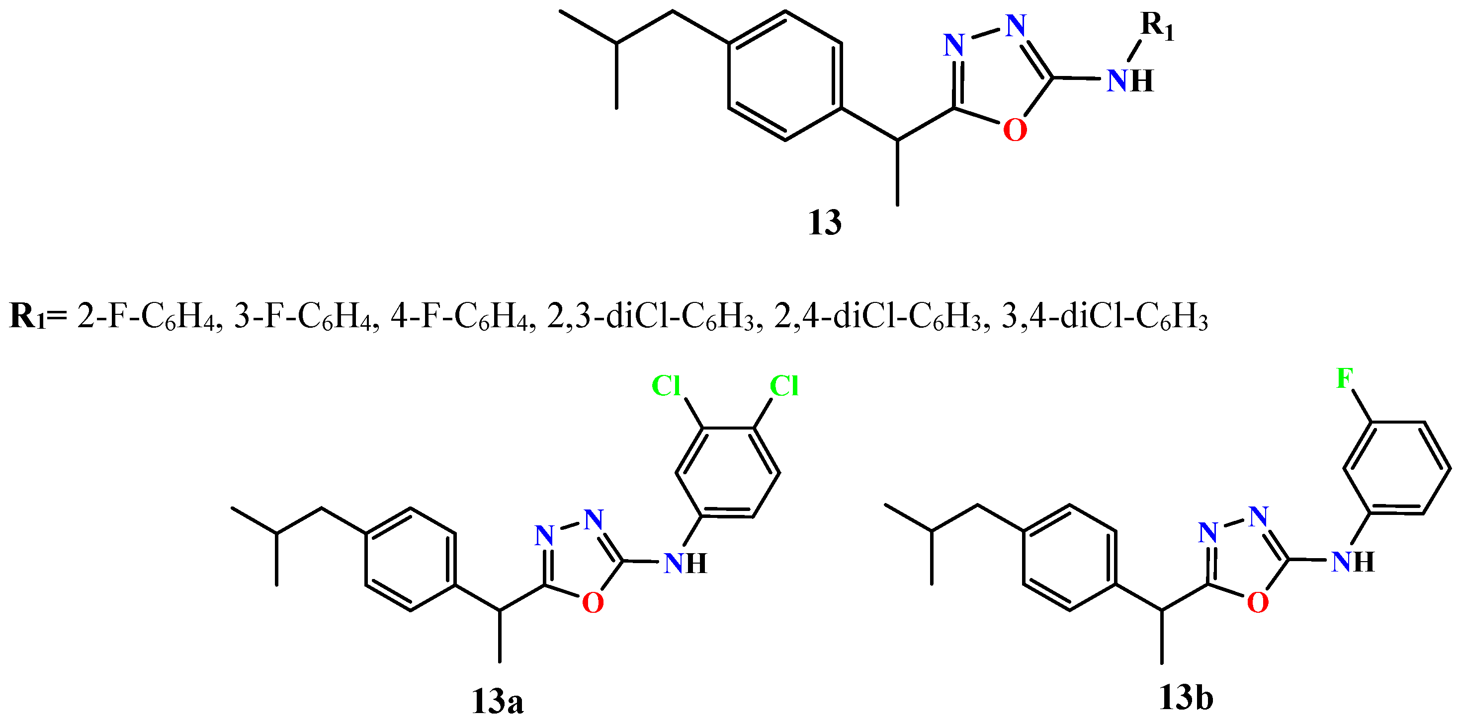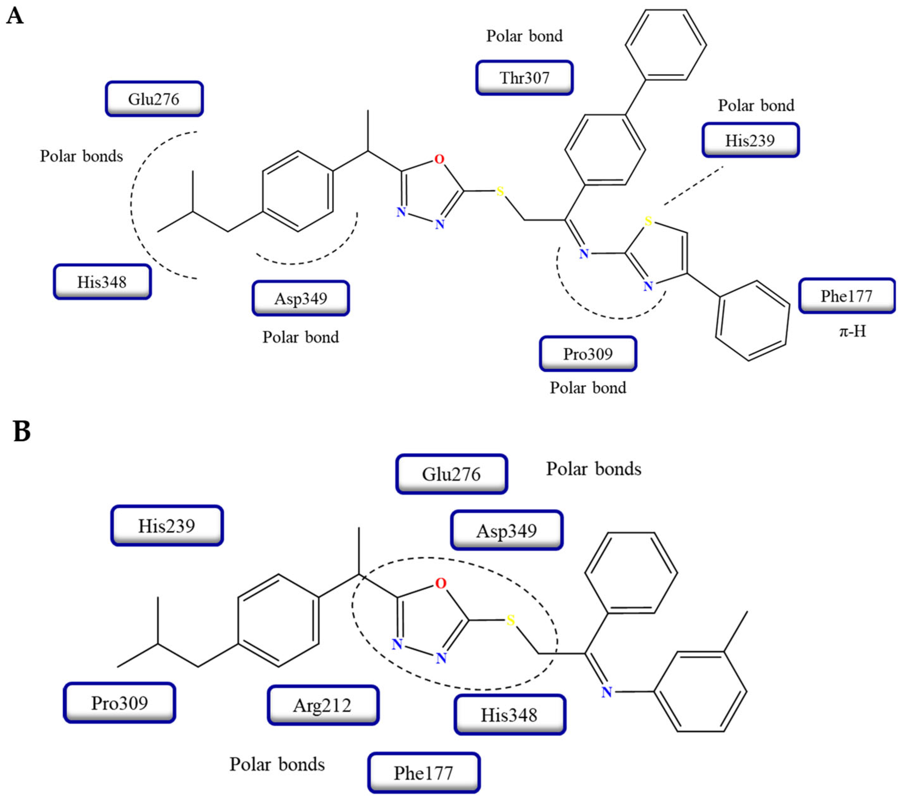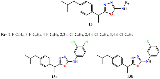 - Daud, S.; Abid, O.U.R.; Sardar, A.; Shah, B.A.; Rafiq, M.; Wadood, A.; Ghufran, M.; Rehman, W.; Zain-ul-Wahab; Iftikhar, F.; et al. Design, synthesis, in vitro evaluation, and docking studies on ibuprofen-derived 1,3,4-oxadiazole derivatives as dual α-glucosidase and urease inhibitors. Med. Chem. Res. 2022, 31, 1–21. [Google Scholar] [CrossRef]