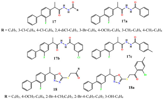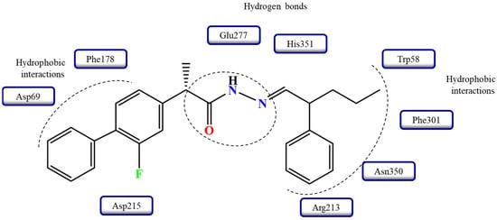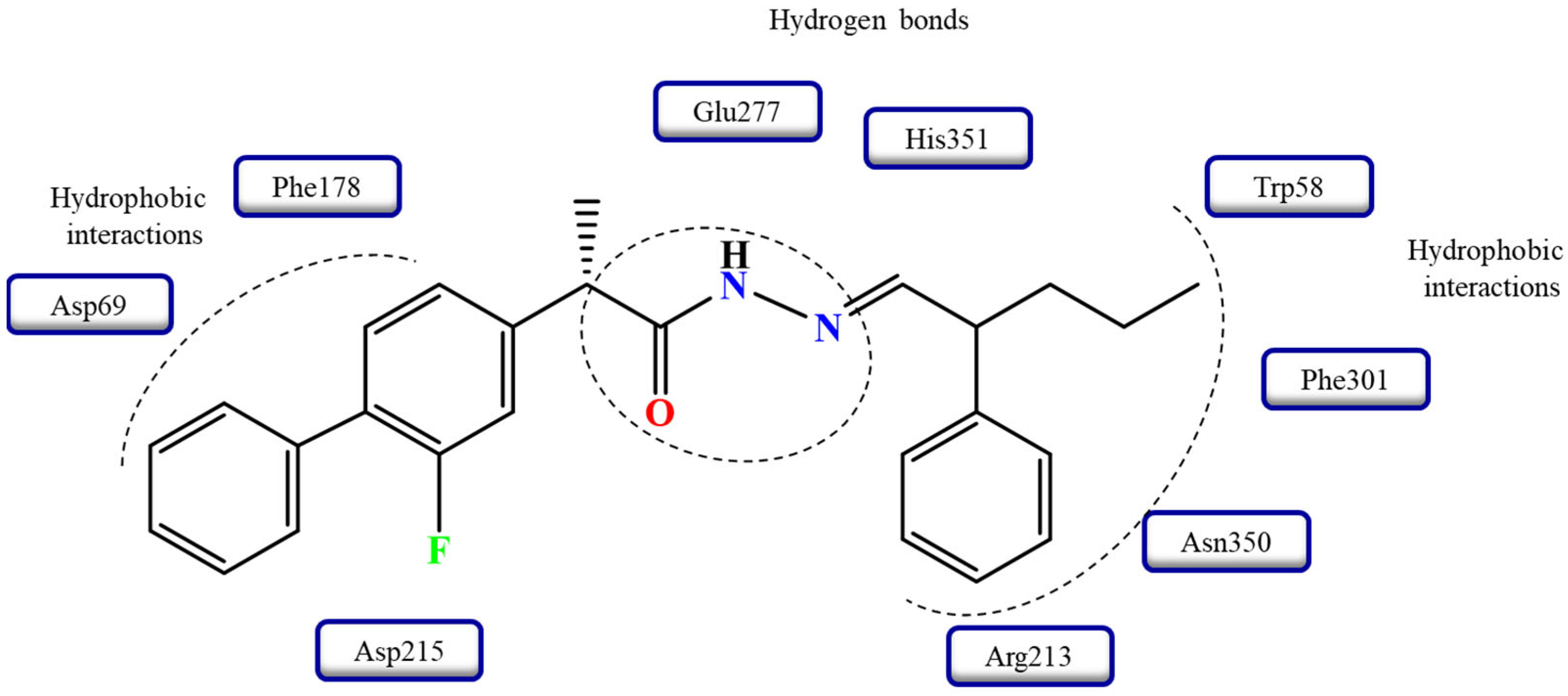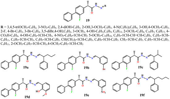 - Alam, A.; Ali, M.; Rehman, N.U.; Ullah, S.; Halim, S.A.; Latif, A.; Zainab; Khan, A.; Ullah, O.; Ahmad, S.; et al. Bio-Oriented Synthesis of Novel (S)-Flurbiprofen Clubbed Hydrazone Schiff’s Bases for Diabetic Management: In Vitro and In Silico Studies. Pharmaceuticals 2022, 15, 672. [Google Scholar] [CrossRef] [PubMed]