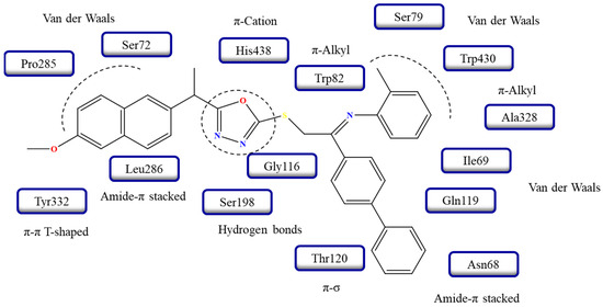 - Sardar, A.; Abid, O.U.R.; Khan, S.; Hussain, R.; Dawood, S.; Rehman, W.; Aziz, T.; Shah, B.; Alharbi, M.; Alasmari, A. Identification of in vitro α-glucosidase and urease inhibitory effect, and in silico studies of naproxen-derived 1,3,4-oxadiazole-based Schiff-base derivatives. J. Mol. Struct. 2024, 1305, 137712. [Google Scholar] [CrossRef]