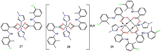 - Shamle, N.J.; Tella, A.C.; Obaleye, J.A.; Balogun, F.O.; Ashafa, A.O.; Ajibade, P.A. Synthesis, characterization, antioxidant and antidiabetic studies of Cu(II) and Zn(II) complexes of tolfenamic acid/mefenamic acid with 1-methylimidazole. Inorg. Chim. Acta 2020, 513, 119942. [Google Scholar] [CrossRef]