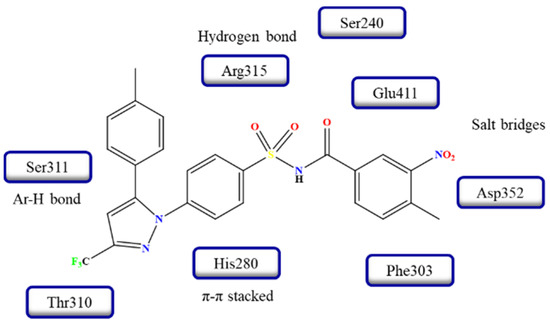 - Kausar, N.; Ullah, S.; Khan, M.A.; Zafar, H.; Atia-Tul-Wahab; Choudhary, M.I.; Yousuf, S. Celebrex derivatives: Synthesis, α-glucosidase inhibition, crystal structures and molecular docking studies. Bioorg. Chem. 2021, 106, 104499. [Google Scholar] [CrossRef]