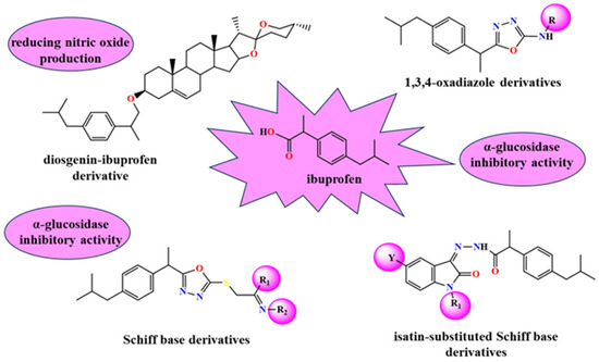 - Daud, S.; Abid, O.U.; Sardar, A.; Abdullah, S.; Shahid, W.; Ashraf, M.; Ejaz, S.A.; Saeed, A.; Shah, B.A.; Niaz, B. Exploring ibuprofen derivatives as α-glucosidase and lipoxygenase inhibitors: Cytotoxicity and in silico studies. Arch. Pharm. 2022, 355, e2200013. [Google Scholar] [CrossRef] [PubMed]
