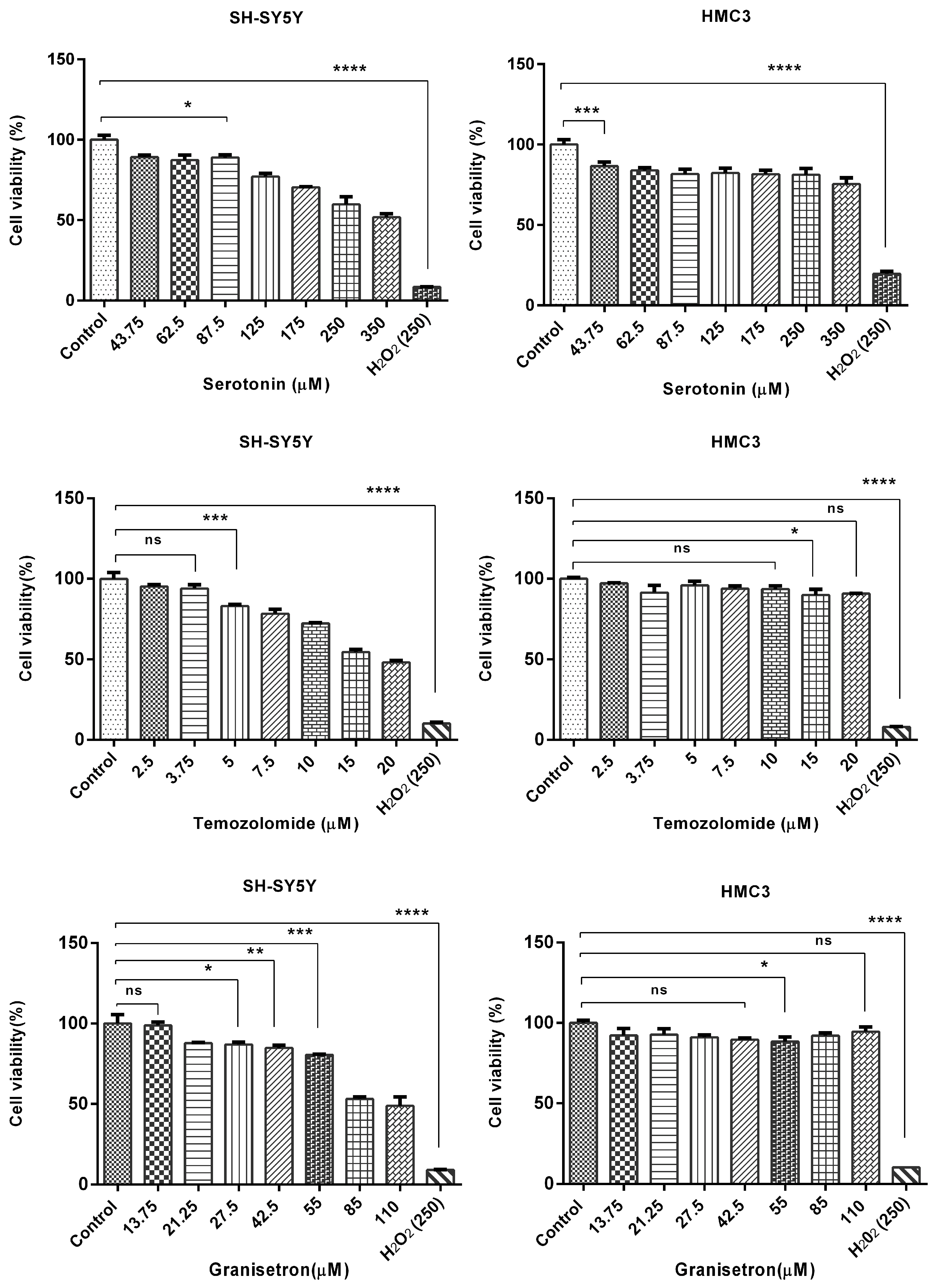 SH-SY5Y and HMC3 cells were treated with 5-HT, TMZ, and GRN for 48 h. Some cells received no treatment (control-untreated). After the incubation period, the MTT assay was implemented to analyze the effects of 5-HT, TMZ, and GRN applied to the cells at selected concentrations on cell viability.