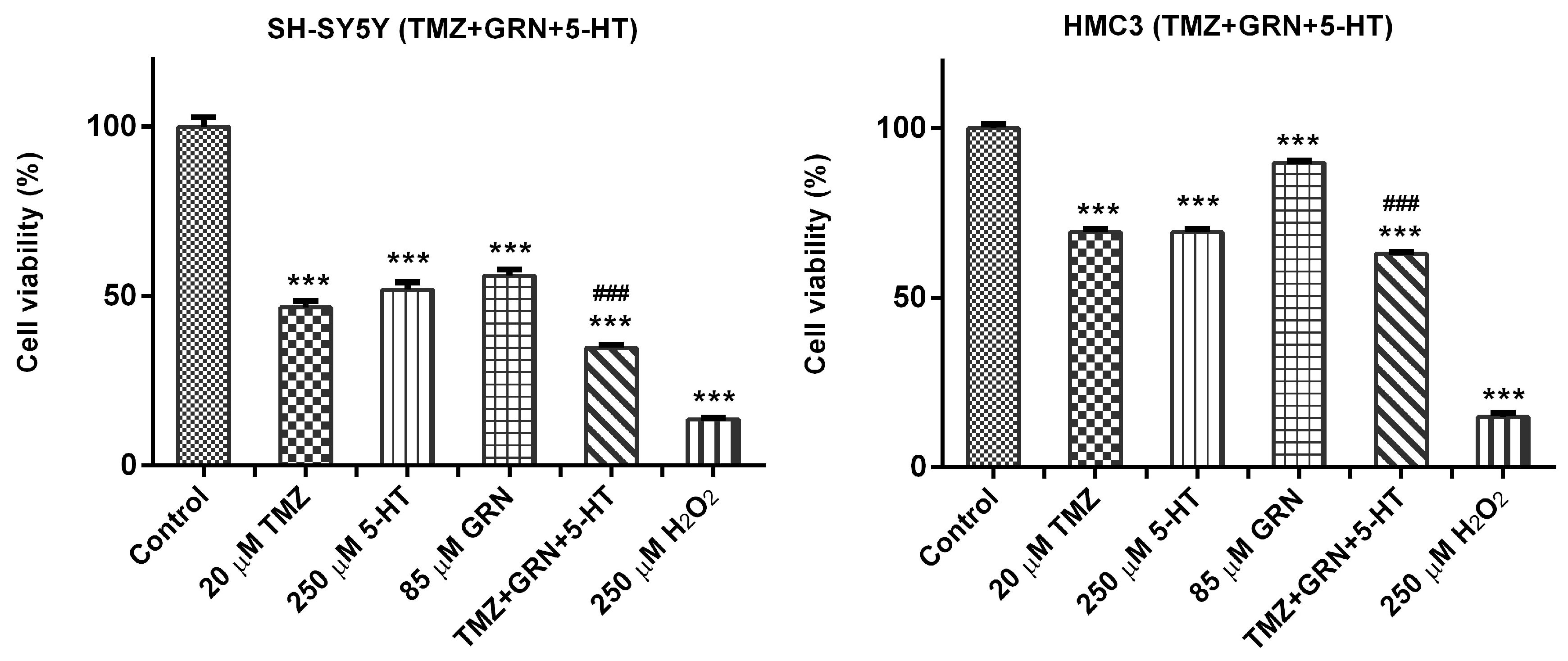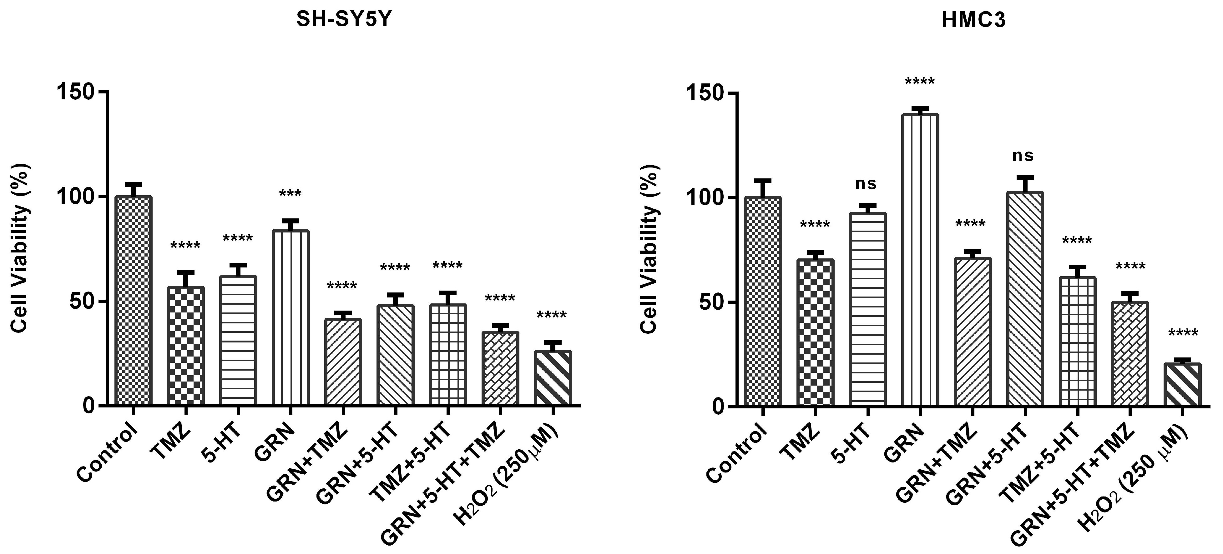 SH-SY5Y and HMC3 cells were treated for 48 h with 5-HT, TMZ, GRN, and their dual and triple combinations. A subset of cells received no treatment and served as the untreated control group.