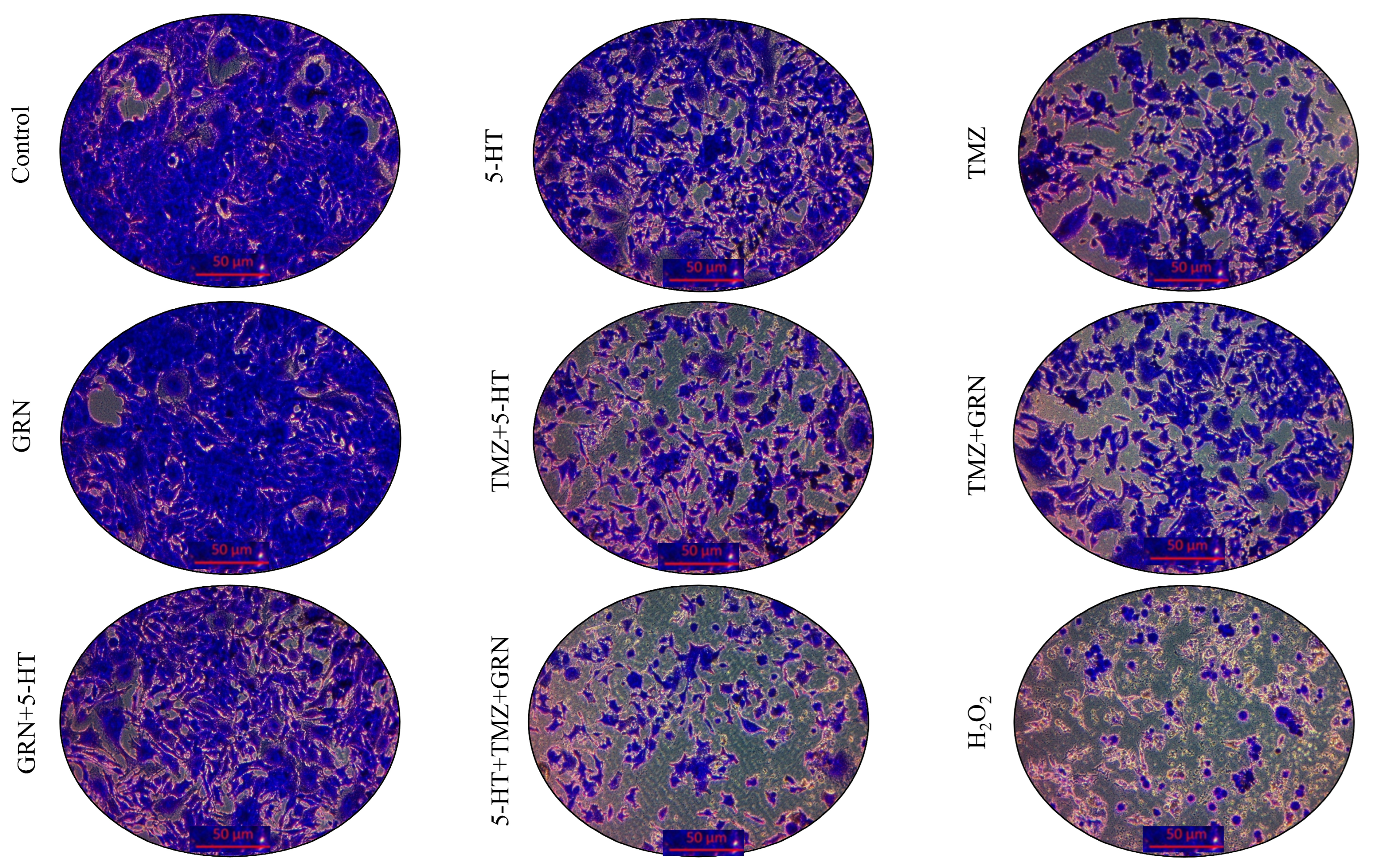 After the incubation period, crystal violet staining was performed to evaluate morphological changes and cell proliferation. The results showed that all combinations (GRN + TMZ, GRN + 5-HT, 5-HT + TMZ, GRN + 5-HT + TMZ) exerted strong cytotoxic effects on SH-SY5Y cells. This indicates that the combined treatments suppressed cell proliferation and reduced the number of adherent cells. Among all treatments, the triple combination of 5-HT, GRN, and TMZ produced the most pronounced antiproliferative effect in SH-SY5Y cells. In comparison with the control group, cell viability decreased significantly (p < 0.001), and morphological examination revealed disrupted cell integrity, cell shrinkage, and rounding with detachment from the surface. These findings suggest that TMZ may act in a synergistic-like manner with the high-concentration antiproliferative effects of GRN and 5-HT, thereby enhancing cell death.
