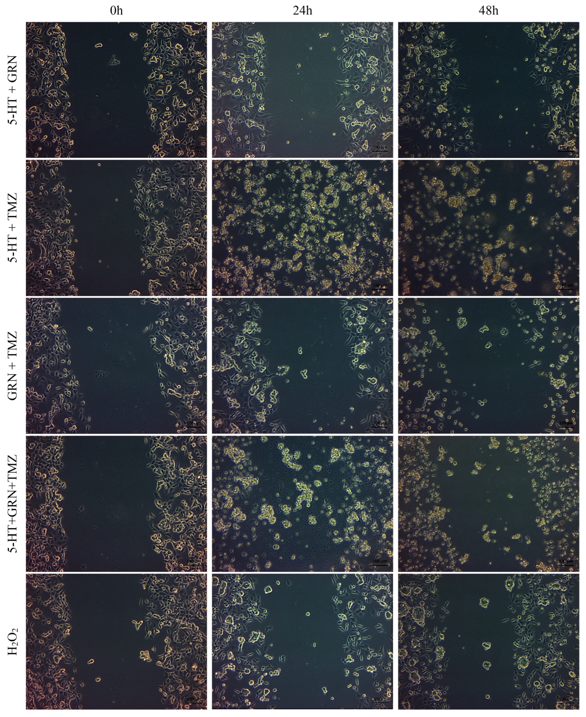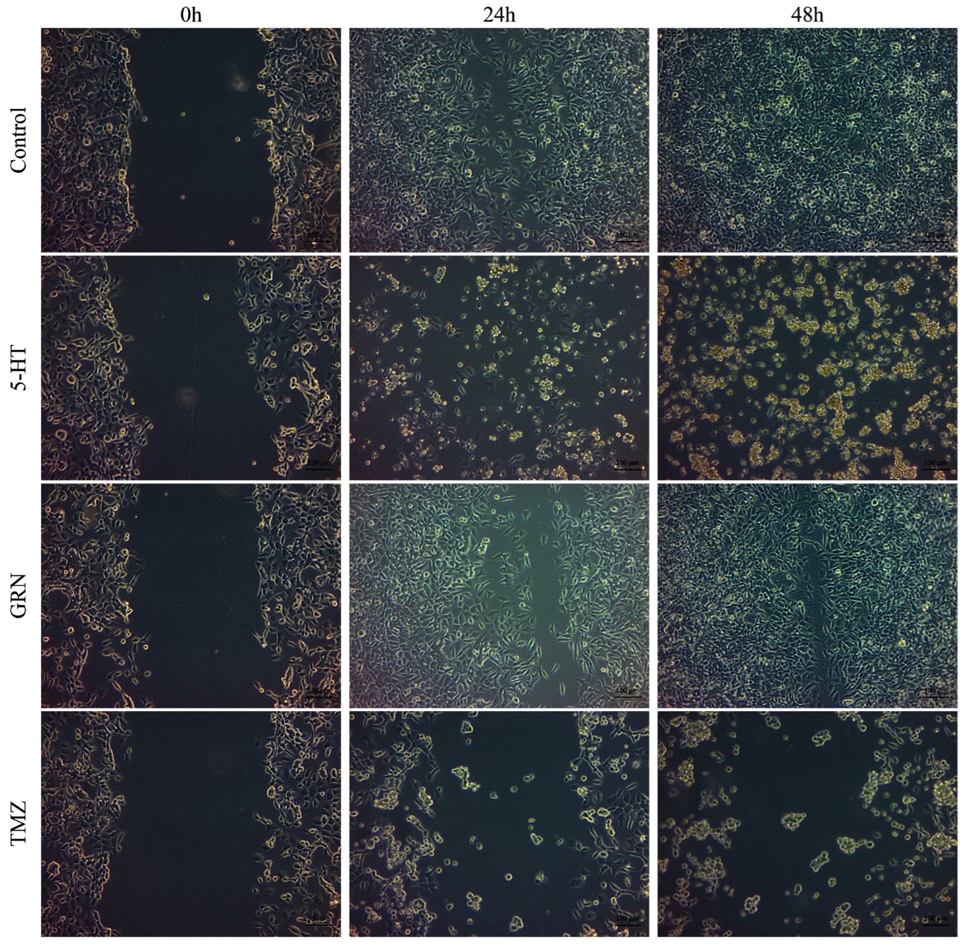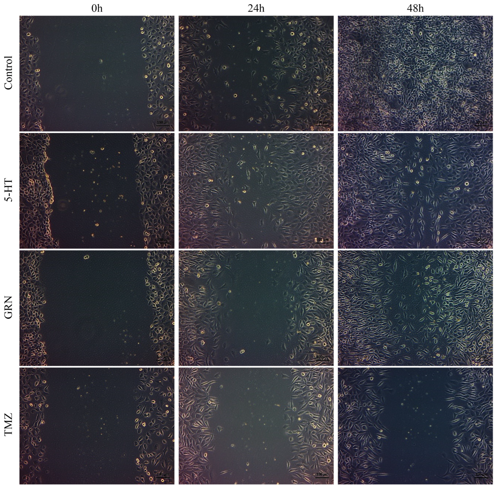 Figure 10). The migration patterns of control cells and those treated with 5-HT, GRN, and TMZ at different time intervals are presented in