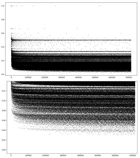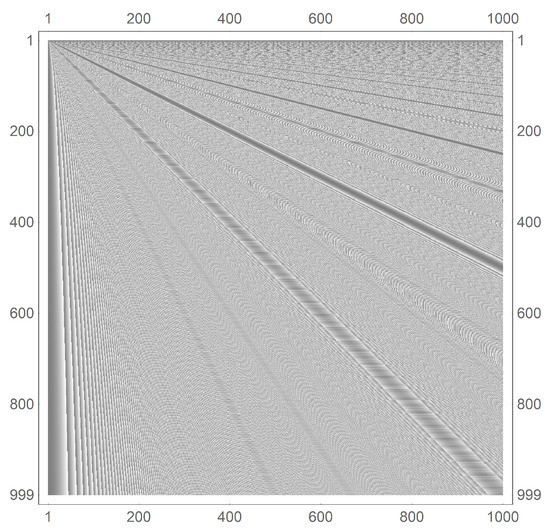 Figure 14 is a visual representation of the self-similar nature of the triangular numbers’ moduli m. The graph shows the (grayscale normalized) (horizontal dimension) versus m (vertical dimension). The dark band running from the origin to the point (1000, 500) is the manifestation of the terminal zeros in each cycle. The alternating dark/light band running along the 45 degree line is a manifestation of the odd (zero) and even () value at the mid-point of the cycle.