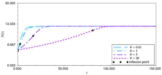 which is the θ-logistic model. In particular, if and (i.e., the ‘ordinary’ logistic model), then (14) shows that the inflexion value is one-half of the asymptotic carrying capacity value, which is well known. If , then we deduce from (14) that tends to for any . This is similar in behaviour to the case when (i.e., in (10)), so that and (1) recovers the Gompertz model