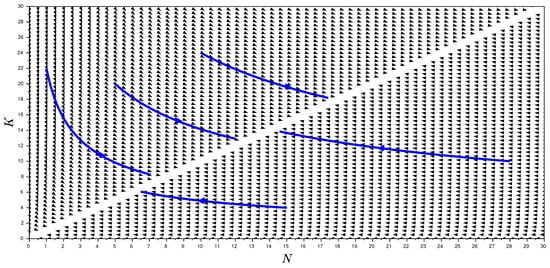 Figure 3 () and Figure 4 () depict some trajectories in the -plane and illustrate that the carrying capacity experiences a decline as the population grows larger. This is a consequence of the proportionality of the per capita growth rates with a negative proportionality constant. Moreover, when the initial conditions are varied, the trajectories approach the equilibrium line . This behaviour is typical for other values of θ as well.
