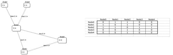 Figure 1 illustrates a simple road network Road = {N, L, f}; N = {Node0, Node1, Node2, Node3, Node4}; L = {zero, one, two, three, four}; along with its undirected connection matrix f. In addition, vulnerabilities V = {Node0: 0.1, Node1: 0.1, Node2: 0.1, Node3: 0.1, Node4: 0.1} and links L = {zero: 0.1, one: 0.1, two: 0.1, three: 0.1, four: 0.1} are shown inscribed within nodes and adjacent to links. In this case, the values of V are the probabilities of node/link failure given that an adjacent node/link has failed, i.e., the probability of spreading. (Of course, V depends on the Threat-Asset pair). This is called viral cascading because faults propagate through the network via adjacent nodes/links.