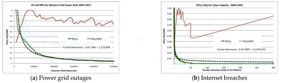Figure 3 illustrates the use of exceedance as a power law in the real world. The exceedance probability of a power grid outage obeys a power law with fractal dimension q = 0.46 indicating high risk due to an extremely long tail. The cyber exploits of 2015 show less exceedance (q = 0.97) and risk, but still relatively high. Note that the measure of consequence is different in each case, but the same mathematical analysis applies.