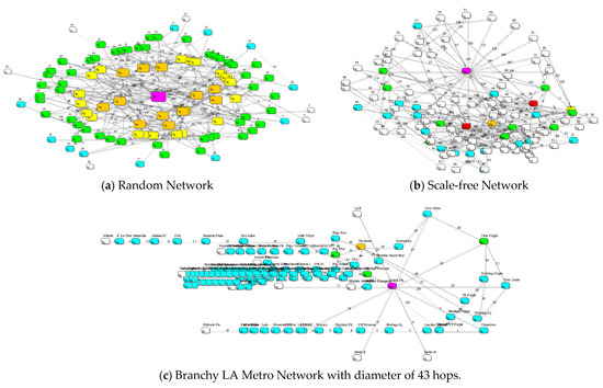 Figure 4 compares a random network, i.e., one constructed by randomly selecting two nodes to connect each of m links, a scale-free network with identical number of nodes and links, but different structure, and the LA Metro network with extreme structure in the form of large diameter [10,11]. The three networks are clearly ranked according to disorder, aka structure, as follows: Random, scale-free, and branchy LA Metro.