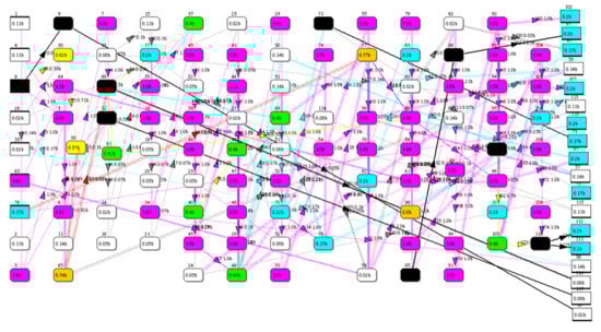 Heat map of IEEE-118 power grid test network with n + m = 304; the 9 blocking nodes and 9 blocking links are colored black, and all other nodes/links are assigned a bottleneck rating from 0 to 1.0 (and color code) based on their network topological betweenness. The network is drawn with sources on the left and sinks on the right.