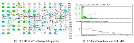 Flow analysis of the IEEE-118 power grid test network. (a). The network organized with sources on the left and sinks on the right. (b). EP(consequence), R(Consequence) and MPL derived from faulting one link at a time and measuring the resulting cascade. Total flow in is 4100, MPL is 72.74, and q = 1.19. Nodes/links heat map colored according to their capacities.