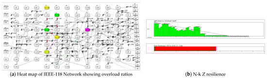Resilience of the IEEE-118 power grid test network. (a). A colored heat map of flow ratios obtained from removal of one link and re-routing. This suggests “hot spots” in the network that are likely to overload when stressed. (b). Calculating flow resilience Z = 5.66 out of 10.0.