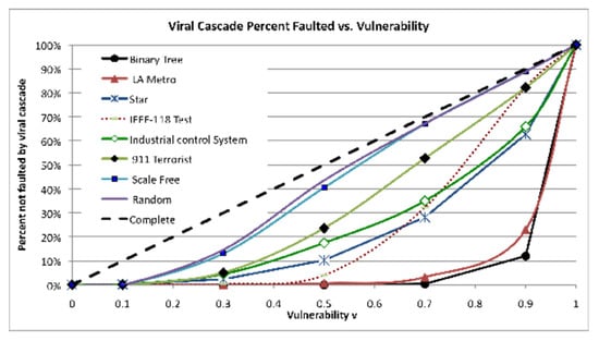 Figure 9 shows how these networks respond to viral cascading versus vulnerability. The likelihood that a certain node is faulted by an adjacent node is highly correlated with the number of connections to the node, i.e., node degree. Intuitively this makes sense, because the number of times a node is contacted by a (possibly faulted) adjacent node is equal to the number of links connecting the node. For the collection of networks in Figure 9, the average value of correlation with fault percentages vs. degree is 86%.
