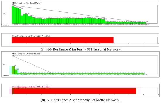 The N-k Z metric is a normalized 0 to 10 measure of resilience based on the rate of decline in MPL risk as overloading is allowed to increase without faulting the link. N-k Z is calculated by Algorithm 1, above, by simulating flow from source-to-sink following a link removal followed by a cascade of overloaded link failures—number (2), in the previous paragraph. The simulation is carried out for each overload cutoff ratio ranging from 1 to maxCutOff (set by user).