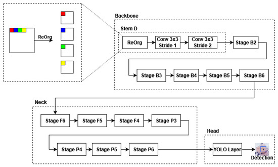 According to Wang et al. [31]: (i) the backbone component is made by a focus layer (Stem D) followed by Stages B2, B3, B4, B5, and B6; (ii) YOLOR uses a CSP convolution as a down-sampling module in each stage to optimize the gradient propagation; (iii) the base channels and repeat number of the backbone layers are set to {128, 256, 384, 512, 640} and {3, 7, 7, 3, 3}, respectively; and, (iv) one difference between YOLOR and YOLOv4 is that YOLOv4 uses Mish as an activation function, while YOLOR uses SiLU.